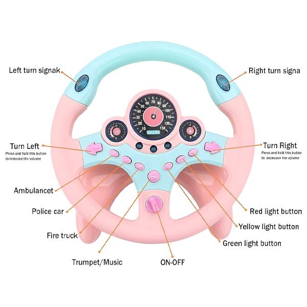 Progettato con suoni divertenti, luci lampeggianti e pulsanti facili da premere, questo volante affascina i piccoli automobilisti e li coinvolge in giochi fantasiosi.